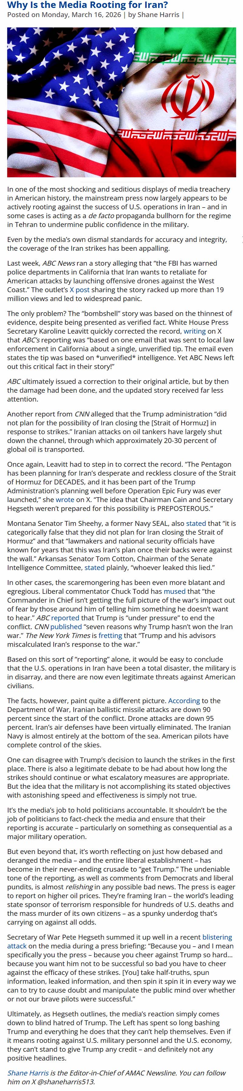 Report: Fascists Controlling Progressive Legacy Media Outlets Serve As De Facto Propaganda Bullhorns For The Tehran Regime To Undermine Public Trust In The "Trump Military" On Behalf Of The Democrat Party And The 2026 November Elections. - AMAC